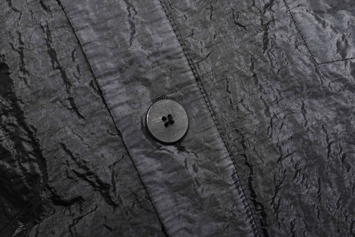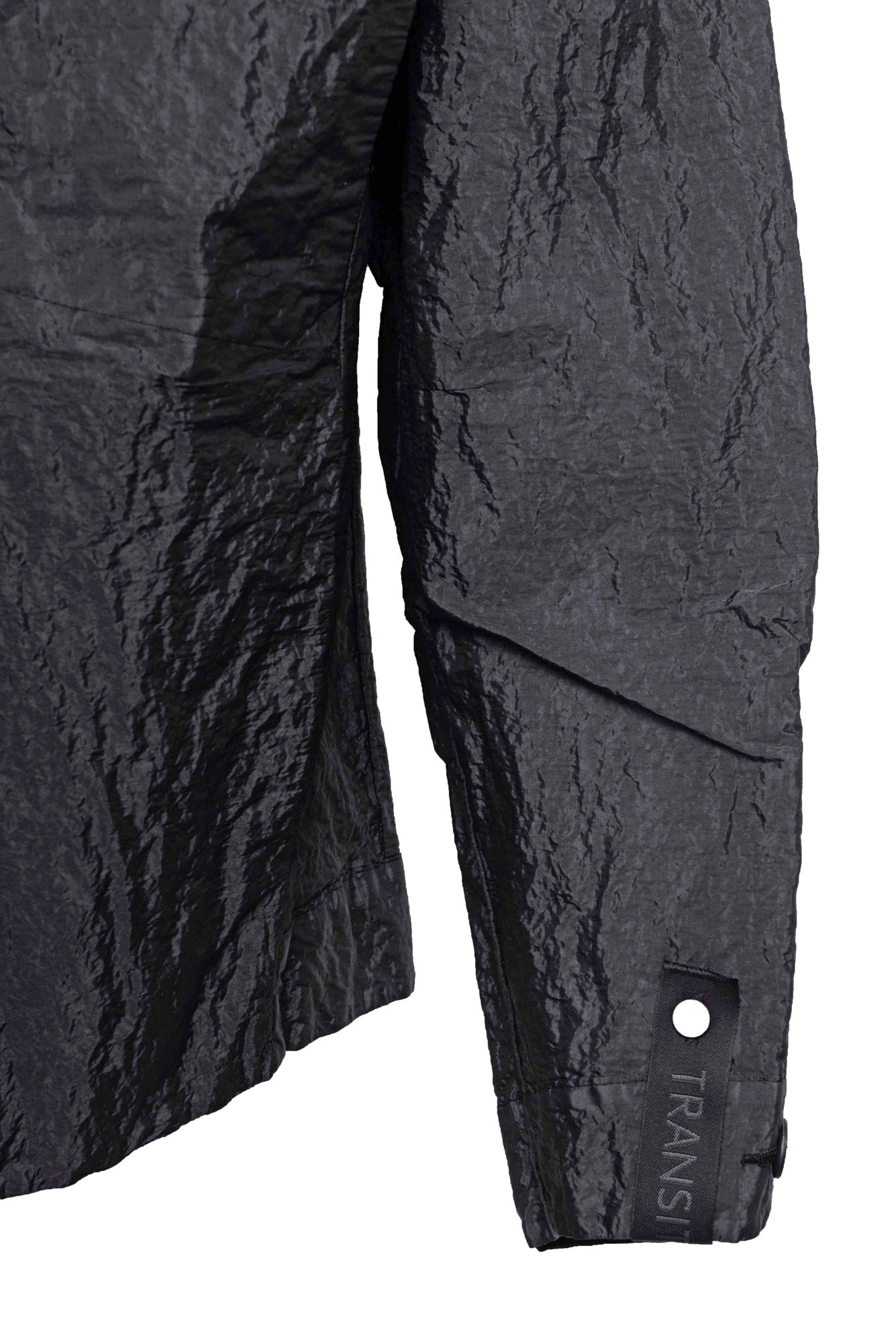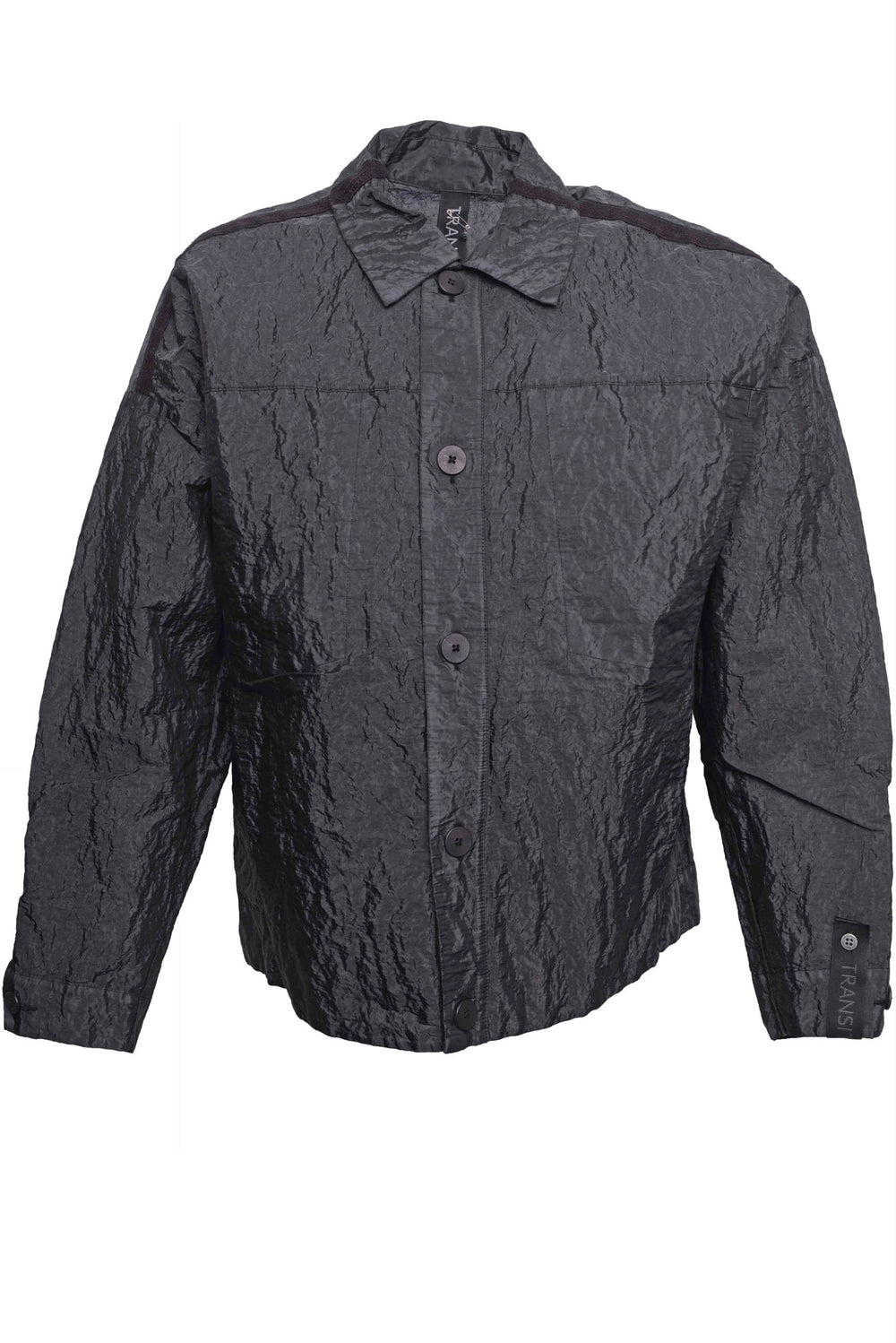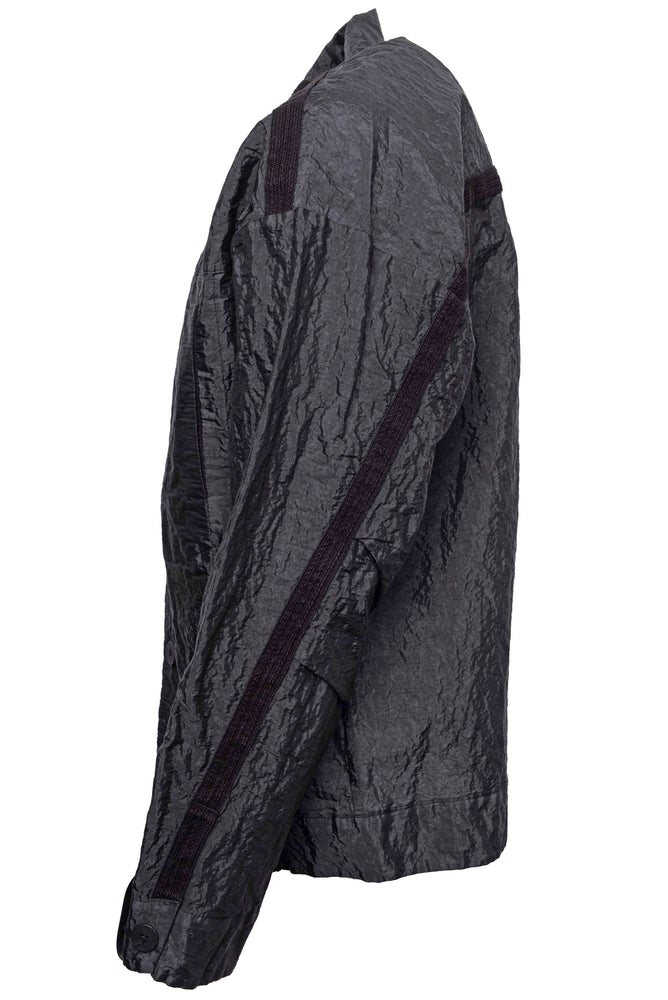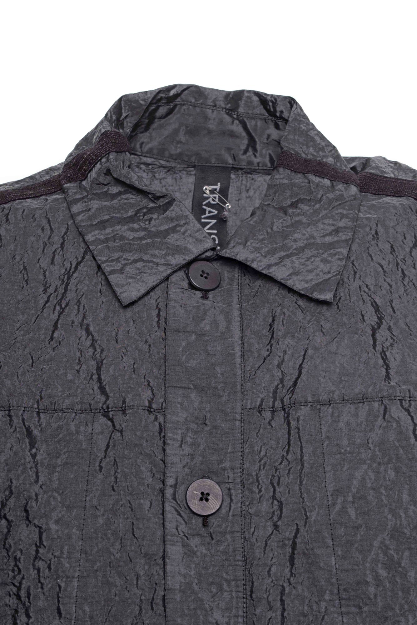 Slightly oversize cotton and polyamide jacket. Button fastening. Four vertical pockets in line with the cut, with tape details over back and sleeves.